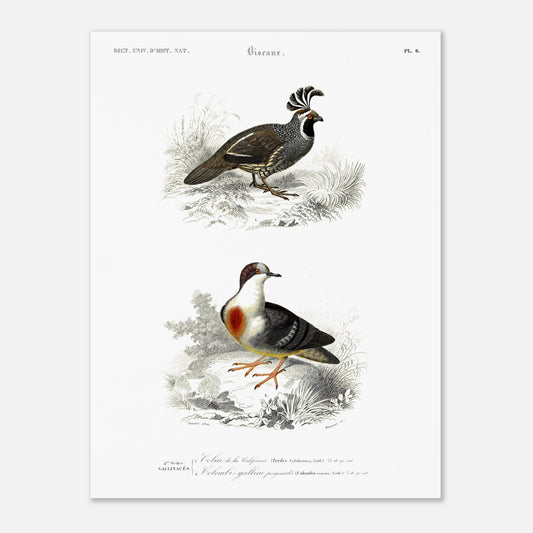 Reproducción de grabado de: Codorniz de California (Perdix californica), Paloma cruenta (Columba cruenta, Lath.)