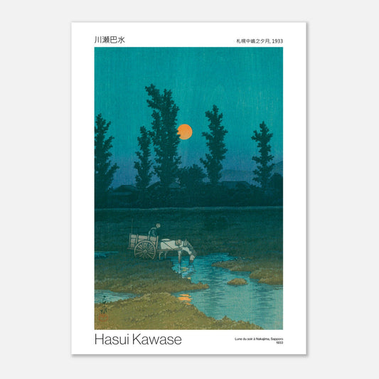 Reproducción del grabado "Evening Moon at Nakajima, Sapporo" de Hasui Kawase en 1933 (título original: "札幌中嶋之夕月"
