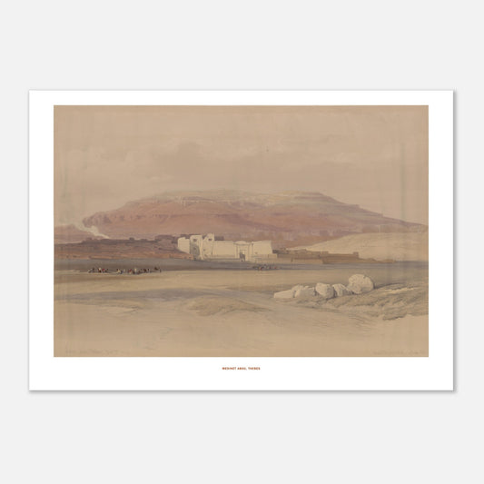 El pórtico visible, construido en parte con materiales de templos más antiguos, da acceso a un templo más pequeño erigido por un faraón posterior. A la izquierda se alzan las ruinas del antiguo palacio de Ramsés IV, cuyas ventanas adornadas con tallas domésticas ofrecen una visión de las antiguas costumbres egipcias. Al fondo, las ruinas del gran templo están dominadas por edificios y casas cristianas, que hoy dan paso a un entorno desolado. Este cautivador sitio, enclavado al pie de la cordillera de Libia y salpicado de tumbas antiguas, es ideal para aficionados a la historia y la arqueología, aportando un toque de antigüedad y grandeza a cualquier espacio.