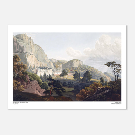Monasterio de Megaspelia, Arcadia es una ilustración de la colección Vistas de Grecia a partir de dibujos publicada por Edward Dodwell en 1821.