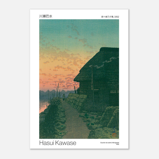 Experimente el atardecer en Morigasaki, ilustrado en esta vibrante lámina. Los cálidos tonos del sol poniente se reflejan en el agua, creando una atmósfera mágica y cautivadora. Los colores suaves y los detalles meticulosos ofrecen una visión serena de la naturaleza al anochecer.
