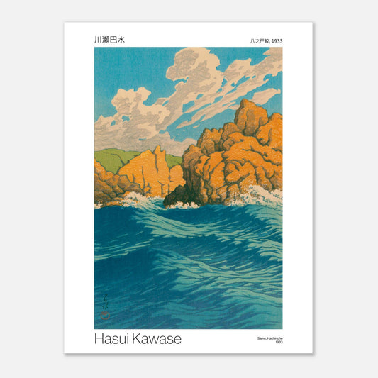 Hasui Kawase captura sutilmente la interacción entre el agua y la tierra, creando una atmósfera dinámica y vibrante. Las delicadas texturas de las olas contrastan con la rugosidad de las rocas, ilustrando el equilibrio de la naturaleza. Este estampado será una adición encantadora a cualquier colección, inspirando calma y reflexión.