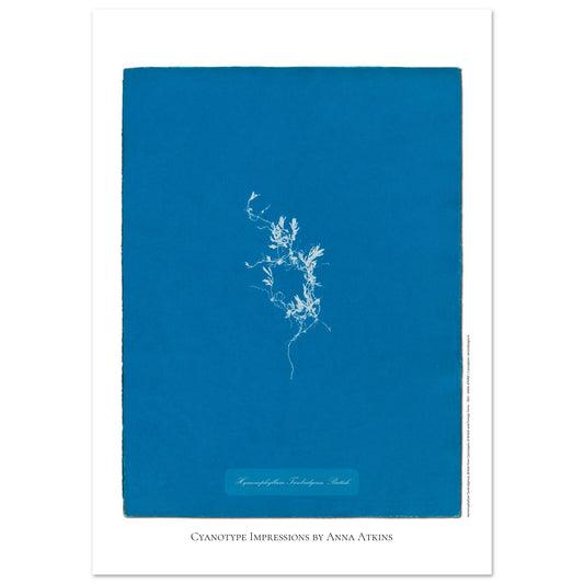 Sumérgete en la elegancia atemporal del cianotipo con esta fiel reproducción de una fotografía de Hymenophyllum Tunbridgense, británico , creada con la técnica pionera de Anna Atkins. Tomada de su emblemática obra *Cianotipos de helechos británicos y extranjeros*, esta impresión captura la delicadeza de la forma de la planta y la profundidad del distintivo azul de Prusia, demostrando la unión entre arte y ciencia que animó a esta botánica y fotógrafa del siglo XIX. Cada detalle del helecho destaca con notable precisión, capturando la esencia de los primeros experimentos fotográficos dedicados al estudio del mundo natural.