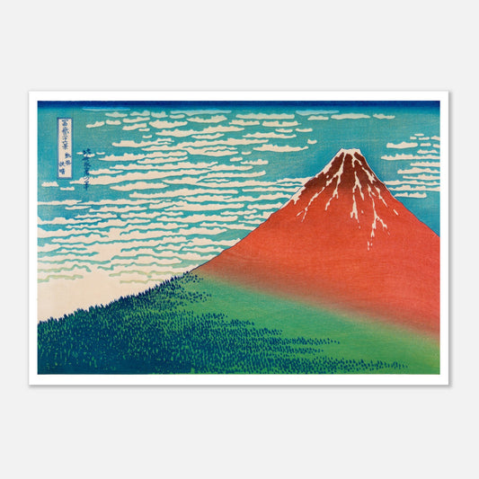 Tiempo despejado con viento favorable (凱風快晴, Gaifū kaisei) , a menudo llamado Fuji Rojo, es una xilografía japonesa del artista ukiyo-e japonés Katsushika Hokusai . Esta obra representa el Monte Fuji iluminado por las primeras luces del amanecer. Los vivos colores, desde el rojo intenso hasta el azul del cielo, capturan un momento de calma y majestuosidad natural, simbolizando la serena fuerza de esta montaña sagrada.
