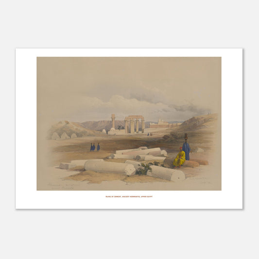 Descubra las ruinas de Erment, la antigua Hermontis, en este evocador grabado de David Roberts. Este sitio, el primero que se encuentra al remontar el Nilo por encima de Tebas, alberga los restos de un templo más modesto, probablemente una mammeisi, o lugar de nacimiento, dedicado a una tríada mitológica egipcia. Construido durante el reinado de Cleopatra y su hijo Ptolomeo Neos César, este templo se caracteriza por una escultura de inferior calidad, reflejo del declive del arte egipcio.