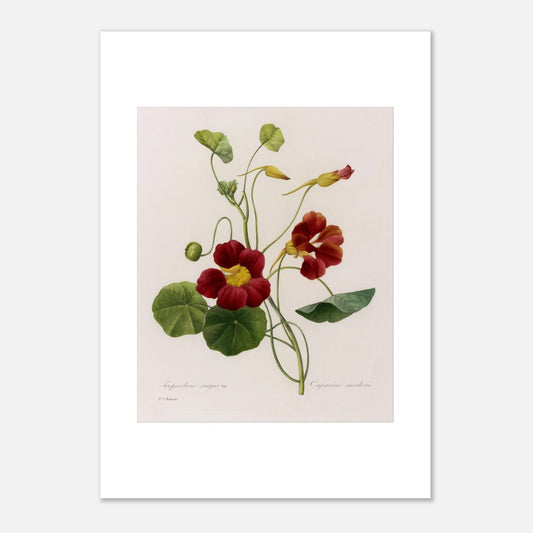 El Tropœolum Majus Var (Capuchina Dorada) es una ilustración que captura la majestuosidad de esta planta con sus delicadas flores y elegantes hojas. Pierre-Joseph Redouté, famoso ilustrador botánico del siglo XVIII, retrata con precisión la belleza natural del Tropœolum majus a través de sus grabados.