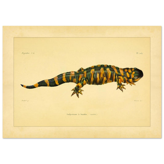 Cette reproduction présente une variété d'Ambystome à bandes, un amphibien urodèle. L'illustration scientifique met en évidence les motifs rayés caractéristiques de cet animal, avec des couleurs vives comme le vert et l'orange.