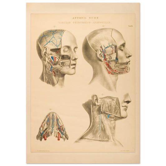 Questa riproduzione autentica di una tavola anatomica tratta dalla collezione di Tavole Chirurgiche e Anatomiche (Chirurgisch-anatomische Tafeln) dell'anatomista tedesco Anton Nuhn (1814-1889) e pubblicata nel 1846, offre una visione approfondita delle strutture interne del collo, della mandibola e delle regioni circostanti l'orecchio e la ghiandola parotide. Il livello di dettaglio è notevole, con particolare attenzione al sistema linfatico, vascolare e nervoso. Questa tavola mostra muscoli, come il muscolo sternocleidomastoideo, dopo la rimozione della pelle e degli strati superficiali, esponendo i linfonodi, le arterie carotidi e i nervi glossofaringei. Viene inoltre evidenziata la complessa anatomia dell'area auricolare, con viste dettagliate dell'orecchio interno e dei vasi associati, consentendo lo studio della loro disposizione naturale.