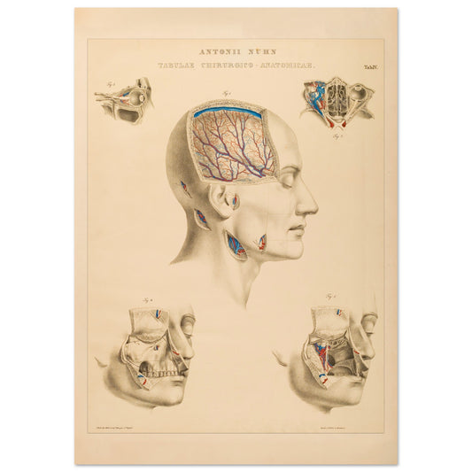 Questa eccezionale riproduzione di una tavola anatomica tratta dalla collezione di Tavole Chirurgiche e Anatomiche (Chirurgisch-anatomische Tafeln) dell'anatomista tedesco Anton Nuhn (1814-1889) e pubblicata nel 1846, offre un'esplorazione dettagliata delle complesse strutture della testa, evidenziando elementi essenziali per la pratica chirurgica. La tavola presenta una vista laterale del cranio, evidenziando le principali arterie craniche, come l'arteria occipitale, temporale, facciale e linguale. Una sezione del cranio è stata rimossa per consentire una chiara osservazione delle strutture interne, tra cui la cavità cranica e gli elementi sottostanti.