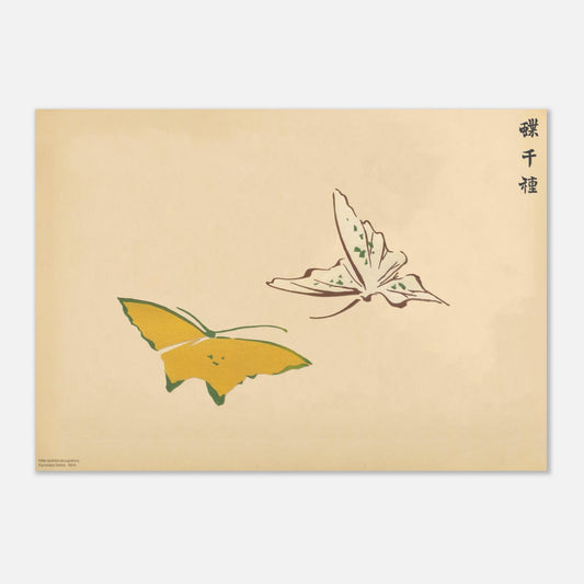 Cette gravure audacieuse, extraite de l’œuvre originale Mille variétés de papillons (Chō senshu) 蝶千種, présente deux grands papillons abstraits : l'un jaune ourlé de vert, l'autre blanc aux bords lie-de-vin, taché de quelques points verts. Les contrastes de couleurs et les formes épurées créent une tension visuelle captivante, où chaque détail semble raconter une histoire. Une œuvre qui allie abstraction et émotion, idéale pour les amateurs d'art contemporain.
