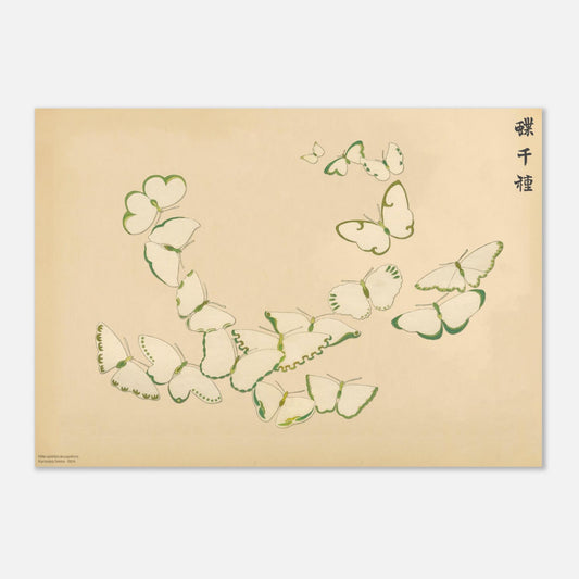Cette gravure délicate présente une collection de papillons aux ailes majoritairement blanches, rehaussées de verts subtils en bordures crénelées. Inspirée de la série Mille variétés de papillons (Chō senshu 蝶千種), elle illustre la minutie et la douceur caractéristiques du travail de Sekka. Une œuvre d'une grande élégance.