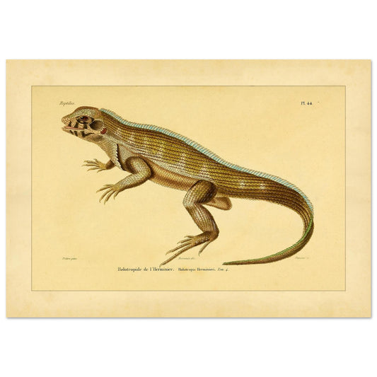 Cette reproduction présente l'Holotropide de Lherminier, un reptile classé dans la famille des Iguaniens. La planche scientifique offre une vue de profil de l'animal, illustrant ses caractéristiques morphologiques.
