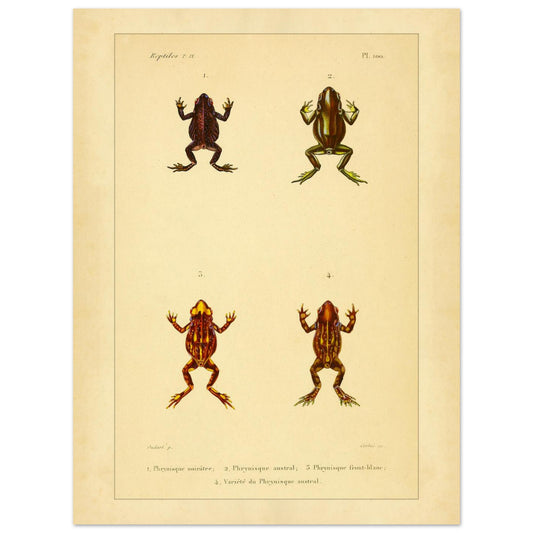 Cette reproduction de planche scientifique ancienne présente quatre variétés de grenouilles identifiées comme Phrynisques : le Phrynisque noirâtre, le Phrynisque austral et le Phrynisque tête blanche. L'illustration met en évidence les variations de couleurs et de motifs entre ces petites grenouilles, principalement dans des tons de brun, vert et jaune, avec des touches de noir.