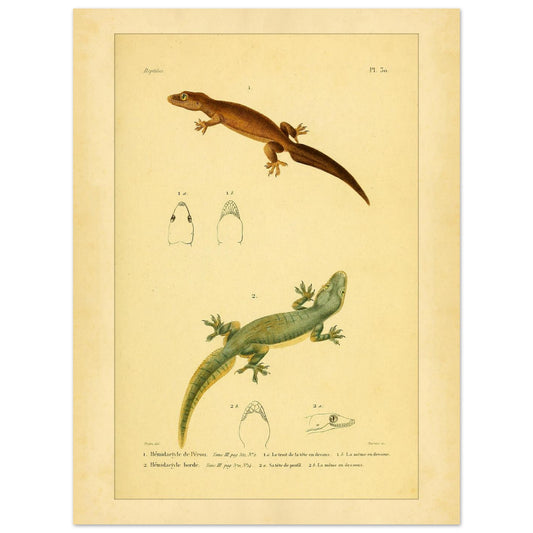 Cette reproduction est idéale pour les amateurs de lézards, les étudiants en zoologie et les collectionneurs d'illustrations scientifiques anciennes. Elle peut enrichir un espace d'étude ou de décoration, ajoutant une touche d'histoire naturelle et d'expertise scientifique.