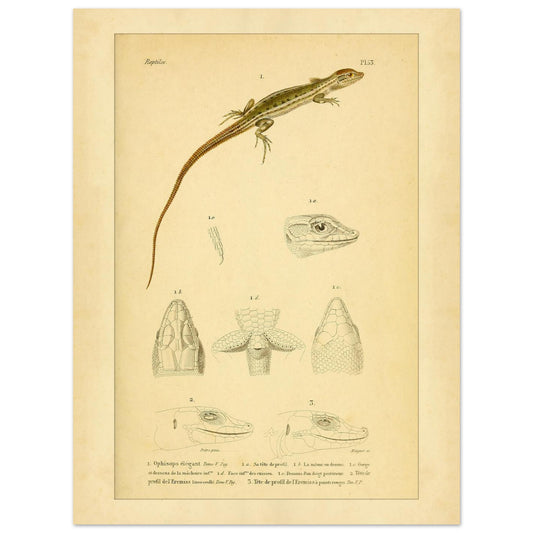 Cette reproduction présente une planche scientifique consacrée à plusieurs espèces de lézards, dont l'Ophiops élégant, l'Erémias linéo-ocellé et l'Erémias à points rouges. Elle inclut des études détaillées de leurs têtes, cous et pattes, mettant en évidence des caractéristiques morphologiques spécifiques comme les carènes des doigts.