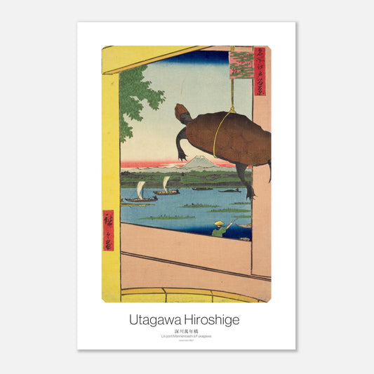 Questa illustrazione raffigura una scena incorniciata dalla struttura di un ponte e da una botte di legno, da cui pende una corda che trattiene una tartaruga in vendita. Al centro della composizione si trova il paesaggio del fiume Fukagawa, punteggiato da isole di canneti e attraversato da diverse imbarcazioni. Nell'angolo in basso a destra, si intravede la sagoma di un vogatore. Sullo sfondo, il Monte Fuji troneggia maestoso. Questa scena simboleggia il confronto tra il commercio terrestre rappresentato dalla tartaruga in vendita e l'eterna sacralità del Monte Fuji, sottolineata dall'importanza del Ponte Mannenbashi, noto anche come "Ponte dei Diecimila Anni". Il simbolismo di longevità associato alla tartaruga risuona con il nome del ponte. Nonostante il netto contrasto tra i due piani, la composizione rimane equilibrata, una caratteristica tipica dello stile di Hiroshige.