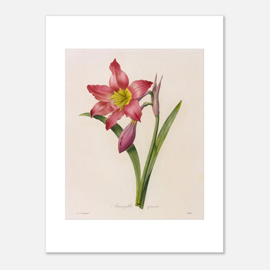 Amaryllis Equestris è un'altra straordinaria opera di Redouté, che illustra la varietà dell'amarillide con i suoi fiori maestosi e i suoi colori vivaci, catturati con una precisione botanica senza pari. Pierre-Joseph Redouté, il rinomato illustratore botanico del XVIII secolo, è una testimonianza del suo talento unico.