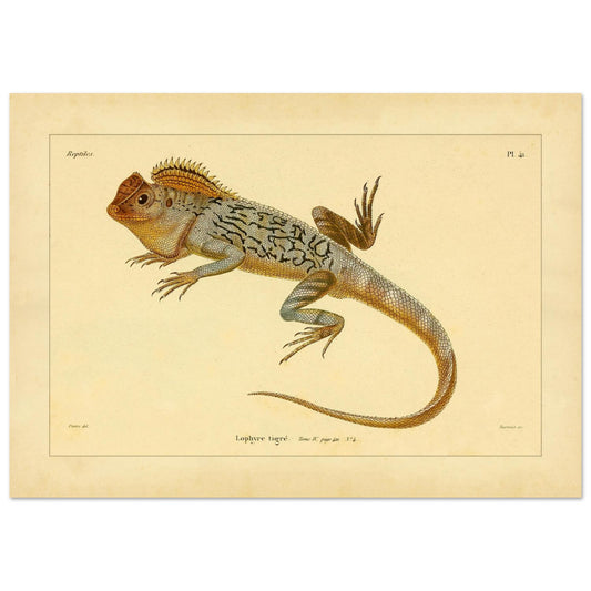 Cette reproduction présente une planche zoologique dédiée au Lophyre tigré, un reptile représenté de profil. L'illustration met en exergue les caractéristiques distinctives de cet animal, avec une attention particulière portée aux détails anatomiques visibles.