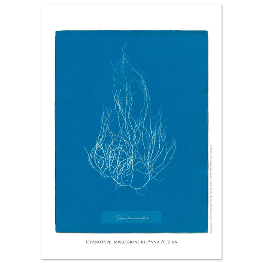 Immergiti nell'eleganza senza tempo della cianotipia con questa fedele riproduzione di una fotografia di Gigartina acicularis , creata utilizzando la tecnica pionieristica di Anna Atkins. Tratta dal suo fondamentale libro "Photographs of British Algae: Cyanotype Impressions", questa stampa cattura la finezza delle forme vegetali e la profondità del caratteristico blu di Prussia, dimostrando il connubio tra arte e scienza che animò questa botanica e fotografa del XIX secolo. Ogni dettaglio delle alghe risalta con straordinaria precisione, catturando l'essenza dei primi esperimenti fotografici dedicati allo studio del mondo naturale.