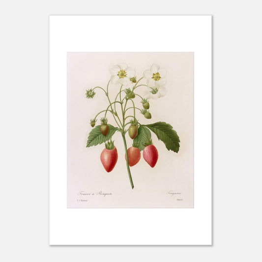 "Fragaria" è un'incisione che mette in risalto l'eccezionale bellezza di questa varietà di fragola, con i suoi fiori delicati e le sue foglie rigogliose. Pierre-Joseph Redouté, il famoso illustratore botanico del XVIII secolo, dimostra il suo talento nel catturare la diversità e la vivacità della flora attraverso le sue incisioni.