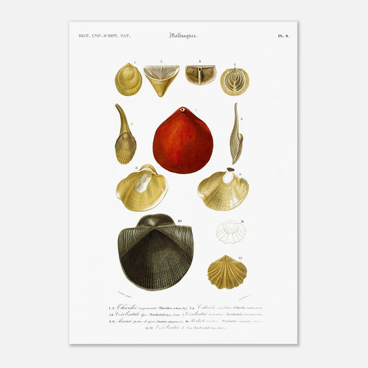 Incisioni riproduttive di: Anomia della buccia di cipolla (Anomia ephippium, Lin.), Pergolato (Productus antiquatus, Sow.), Terebratula della lira (Terebratula lyra, Lamk.), Terebratula lenticolare (Terebratula lenticularis, Desh.), Terebratula di Say (Terebratula sayi, Morton), Tecid radiante (Thecidea radians, Def.), Sandaline Calceola (Calceola sandalina, Lamk.)