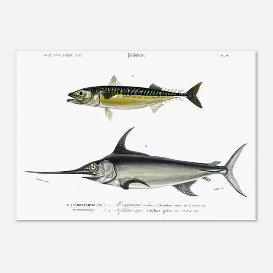 Riproduzione tramite incisione di: sgombro Colias (Scomber Colias, Val.), pesce spada Xiphias o pesce spada comune (Xiphias gladius, Lin.)