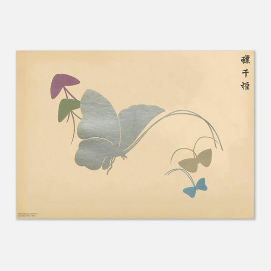 Cette œuvre saisissante, tirée de la série emblématique Mille variétés de papillons (Chō senshu) 蝶千種, met en scène un très grand papillon entièrement argenté, rehaussé de paillettes dans la peinture, accompagné de plusieurs petits papillons minimalistes en ombres chinoises, déclinés dans des tons froids. Le contraste entre l'éclat du grand papillon et la simplicité des petits crée une tension visuelle captivante, où chaque élément trouve sa place. Une pièce qui allie luxe et épure, idéale pour les amateurs d'art contemporain.