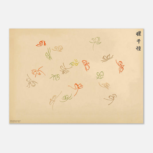 Cette reproduction minimaliste, inspirée de l'œuvre Mille variétés de papillons (Chō senshu) 蝶千種, capture une volée de dix-huit petits papillons, un tiers en rouge orange, un tiers en vert jaune, et un tiers en marron clair. Leurs traits épurés et stylisés évoquent une danse légère et désordonnée, où chaque papillon semble flotter avec grâce. Une œuvre qui célèbre la diversité des couleurs et la simplicité des formes, idéale pour les amateurs de design épuré.