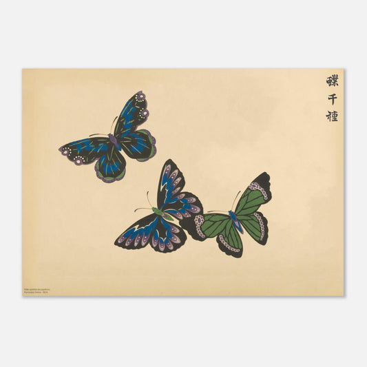 Admirez cette estampe enchanteresse, où des papillons aux ailes vertes, noires et bleues, agrémentées de touches mauves, évoquent la lumière filtrée à travers des vitraux. Tirée de la série Mille variétés de papillons (Chō senshu 蝶千種), cette œuvre traduit la fascination de Sekka pour la lumière et la transparence. Une pièce qui transforme la nature en une expérience visuelle presque mystique.