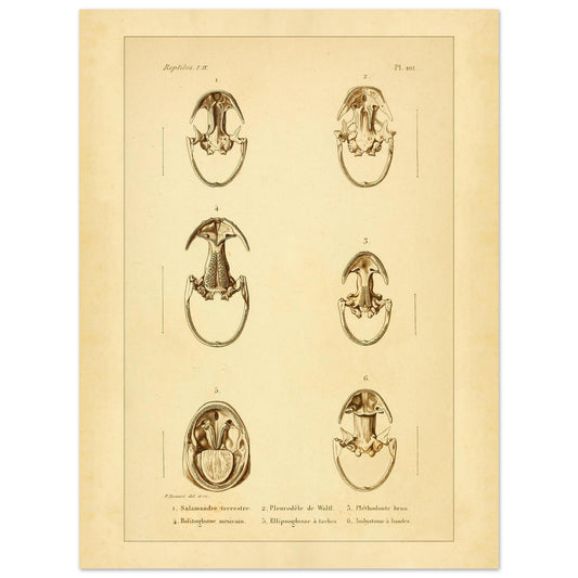 Cette reproduction propose une étude anatomique des têtes de divers amphibiens urodèles, incluant la Salamandre terrestre, le Pleurodèle de Waltl et le Bolitoglosse Mexicain. Les illustrations, dépouillées des parties molles, montrent les structures osseuses des mâchoires et des bouches, offrant un aperçu unique de leur anatomie interne.