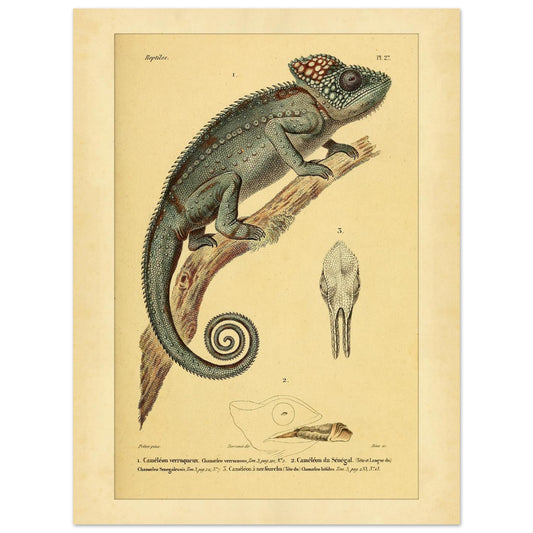 Cette reproduction d’une planche naturaliste met en lumière plusieurs espèces de la famille des caméléoniens, extraites de l'ouvrage de référence Erpétologie générale. On y observe une étude détaillée du caméléon verruqueux en situation ainsi que des focus anatomiques précis sur le caméléon du Sénégal et le caméléon à nez fourchu.