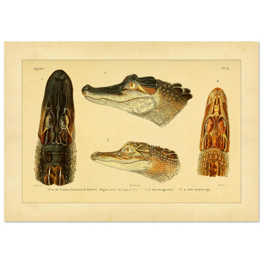 Cette reproduction d’une planche naturaliste illustre avec précision le Caïman à museau de Brochet. Issue de l'ouvrage de Duméril, l'image présente des vues anatomiques détaillées, de profil et de dessus, permettant d'observer la morphologie de l'animal à l'âge moyen et durant sa jeunesse.