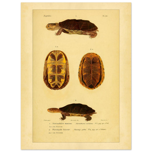 Cette reproduction de planche encyclopédique présente deux espèces de tortues : le Sternothère marron et la Platémyde bossue. La planche détaille leurs carapaces distinctives, offrant un aperçu visuel précis des spécimens étudiés. Les couleurs dominantes sont le brun, le jaune et l'orange.