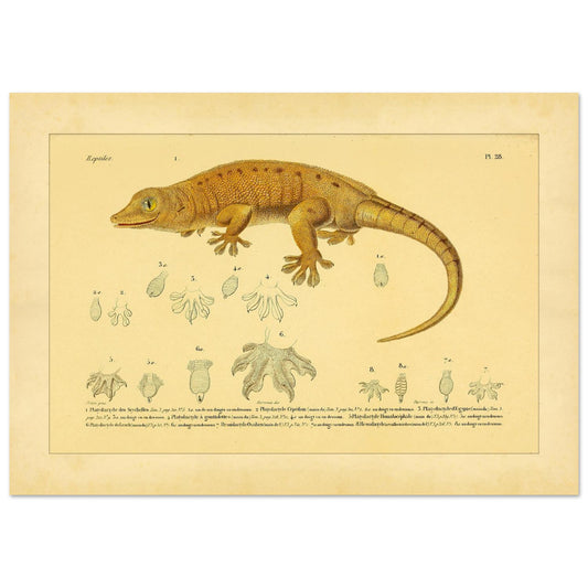 Issue de l'« Erpétologie générale » d'André-Marie-Constant Duméril (1834-1840), cette gravure fait partie d'une encyclopédie visant à décrire la diversité des reptiles. Elle appartient à la famille des Geckotiens et met en évidence la précision des dessins anatomiques réalisés à l'époque pour l'étude scientifique.