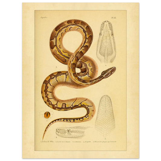Cette reproduction met en lumière le Python de Séba, un serpent majestueux représenté enroulé. La planche scientifique inclut des études détaillées de sa tête sous différents angles (dessus, dessous, profil) et une vue de son œil entouré de plaques, offrant un aperçu anatomique précis.