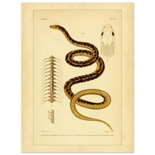 Cette planche est particulièrement intéressante pour les étudiants en zoologie, les herpétologues et les amateurs d'illustrations scientifiques. Elle peut être utilisée pour un projet décoratif ou éducatif, apportant un caractère unique et historique.