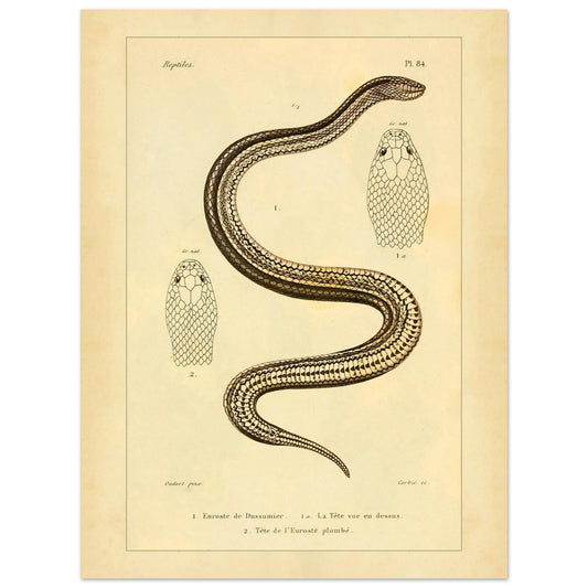 Tirée de l'ouvrage « Erpétologie générale ou Histoire naturelle complète des reptiles » (1834-1840) de Duméril, cette illustration appartient à la classification des Ophidiens, sous-ordre des Opisthoglyphes. Elle témoigne de l'étude détaillée des reptiles et de la qualité graphique des planches de l'époque.