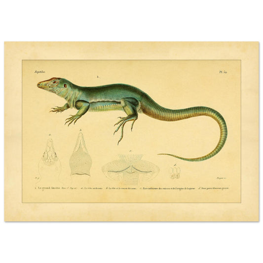 Cette reproduction de planche encyclopédique dépeint le Grand Améiva, un lézard de la famille des Lacertiens. La planche propose une vue d'ensemble de l'animal, accompagnée de détails anatomiques cruciaux tels que la tête vue de dessus et de dessous, la face inférieure des cuisses et des pores fémoraux, offrant une analyse morphologique complète. Les couleurs principales sont le vert, le jaune et le noir.