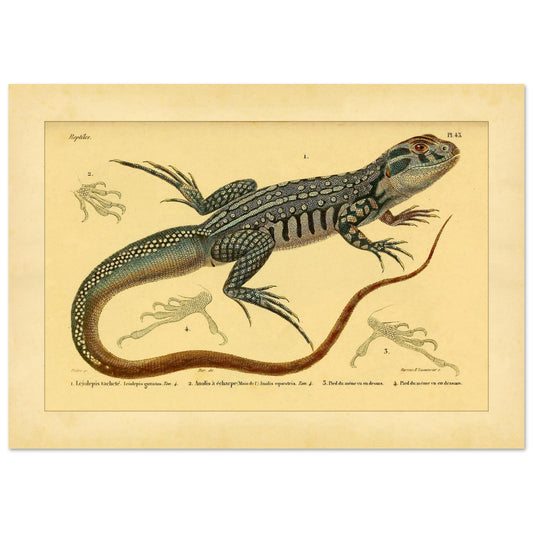 Cette reproduction est particulièrement adaptée aux amateurs de reptiles, aux étudiants en zoologie et à toute personne appréciant les illustrations scientifiques historiques. Elle apportera une touche d'authenticité et de savoir à un bureau, une bibliothèque ou une salle d'étude.