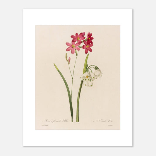 Riproduzione della tavola botanica Ixia con fiori di flox e fiocco di neve estivo di Pierre-Joseph Redouté