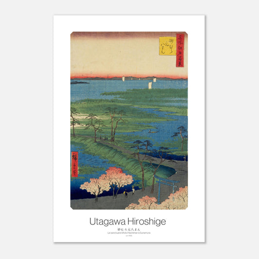 Riproduzione d'arte giapponese che illustra la bellezza pacifica e raffinata della natura giapponese - Santuario Moto Hachiman a Sunamura di Hiroshige