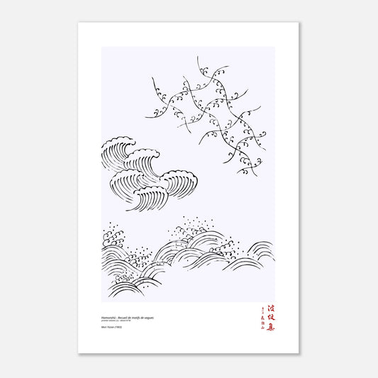 Immergetevi nell'eleganza senza tempo dell'arte giapponese con questa riproduzione del motivo n. 50 del primo volume (上) di Hamonshū , un'iconica collezione creata nel 1903 da Mori Yūzan. Il titolo originale (波紋集), che letteralmente significa "Collezione di motivi a onda", mette in risalto un tema universale: il movimento fluido e armonioso dell'acqua e le forme che lo evocano. Pensata per guidare gli artigiani nell'ornamentazione delle loro creazioni, Hamonshū riunisce una varietà di motivi, che spaziano da ondulazioni astratte a composizioni più figurative, talvolta vicine al paesaggio, sempre intrise di poesia e di eccezionale maestria estetica.