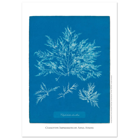 Immergiti nell'eleganza senza tempo della cianotipia con questa fedele riproduzione di una fotografia di Chylocladia clavellosa , creata utilizzando la tecnica pionieristica di Anna Atkins. Tratta dal suo fondamentale libro "Photographs of British Algae: Cyanotype Impressions", questa stampa cattura la finezza delle forme vegetali e la profondità del caratteristico blu di Prussia, dimostrando il connubio tra arte e scienza che animò questa botanica e fotografa del XIX secolo. Ogni dettaglio delle alghe risalta con straordinaria precisione, catturando l'essenza dei primi esperimenti fotografici dedicati allo studio del mondo naturale.