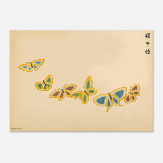 Cette illustration frappante met en scène six papillons aux ailes vertes, bleues et marron, tous unis par une large bordure jaune orangé. Tirée de Mille variétés de papillons (Chō senshu 蝶千種), elle combine contraste et harmonie avec une précision remarquable. Une œuvre équilibrée et lumineuse.