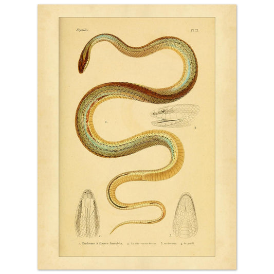 Tirée de l'ouvrage encyclopédique « Erpétologie générale ou Histoire naturelle complète des reptiles » par André-Marie-Constant Duméril (1834-1840), cette illustration scientifique s'inscrit dans la classification des Ophidiens, plus spécifiquement des Opisthoglyphes. Elle met en lumière la diversité des serpents et l'exactitude des descriptions naturalistes de l'époque.
