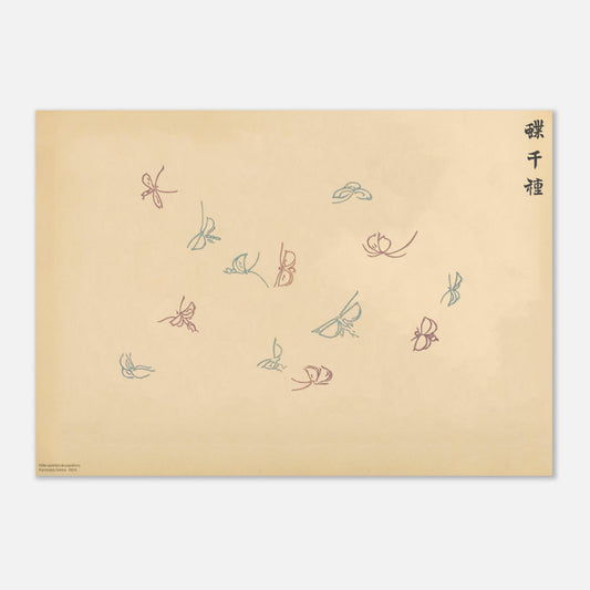 Cette reproduction minimaliste, extraite de l’œuvre originale Mille variétés de papillons (Chō senshu) 蝶千種, capture une volée de petits papillons, une moitié bleue et l'autre rose sale, aux traits épurés et stylisés. Leurs vols éparpillés évoquent une danse légère et spontanée, où chaque papillon semble suivre son propre chemin. Une œuvre qui célèbre la liberté et la simplicité, idéale pour les amateurs de design épuré et de poésie visuelle.