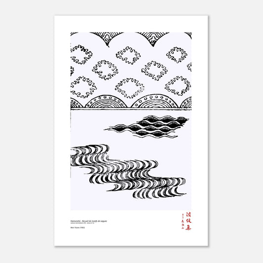 Faites entrer la poésie de l’art japonais dans votre espace avec cette reproduction du motif N°32 tirée du volume intermédiaire (中) du Hamonshū, le célèbre recueil de motifs réalisé en 1903 par Mori Yūzan. Le titre (波紋集), qui peut être traduit par « Recueil de motifs de vagues », met en avant un thème universel : la fluidité et l’harmonie des formes inspirées de l’eau. Destiné à guider les artisans, ce recueil regorge de compositions variées, allant de vagues abstraites à des paysages stylisés, toujours empreintes de sensibilité et de raffinement.