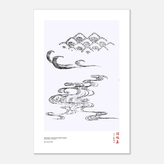 Plongez dans l’élégance intemporelle de l’art japonais avec cette reproduction du motif N°35 extraite du dernier volume (下) du Hamonshū, un recueil emblématique réalisé en 1903 par Mori Yūzan. Le titre original (波紋集), signifiant littéralement « Recueil de motifs de vagues », cette collection met en lumière un thème universel : le mouvement fluide et harmonieux de l’eau et des formes qui l’évoquent. Conçu pour guider les artisans dans l’ornementation de leurs créations, Hamonshū regroupe des motifs variés, allant d’ondulations abstraites à des compositions plus figuratives, parfois proches du paysage, toujours empreintes de poésie et d’une maîtrise esthétique exceptionnelle.