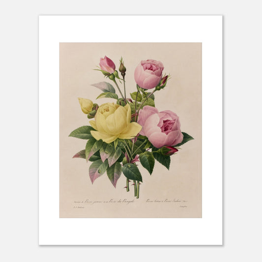 Affiche botanique ancienne Variété de Rose Jaune et Rose du Bengale par Pierre-Joseph Redouté