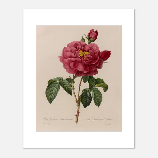 Rosa Gallica Aurelianensis (La Duchesse d'Orléans) est une gravure qui met en lumière la beauté distinctive de cette variété de rosier avec ses fleurs spectaculaires et ses feuilles luxuriantes. Pierre-Joseph Redouté, célèbre illustrateur botanique du XVIIIe siècle, montre son expertise dans la représentation des différentes nuances et formes florales.